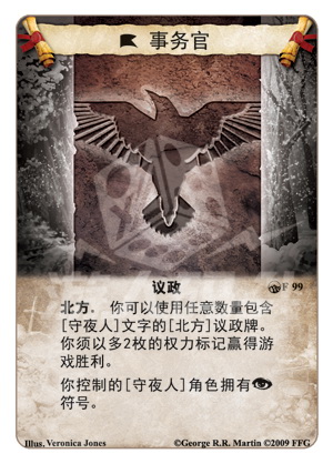 你可以使用任意数量包含[守夜人]文字的[北方]议政牌。你须以多2枚的权力标记赢得游戏胜利。